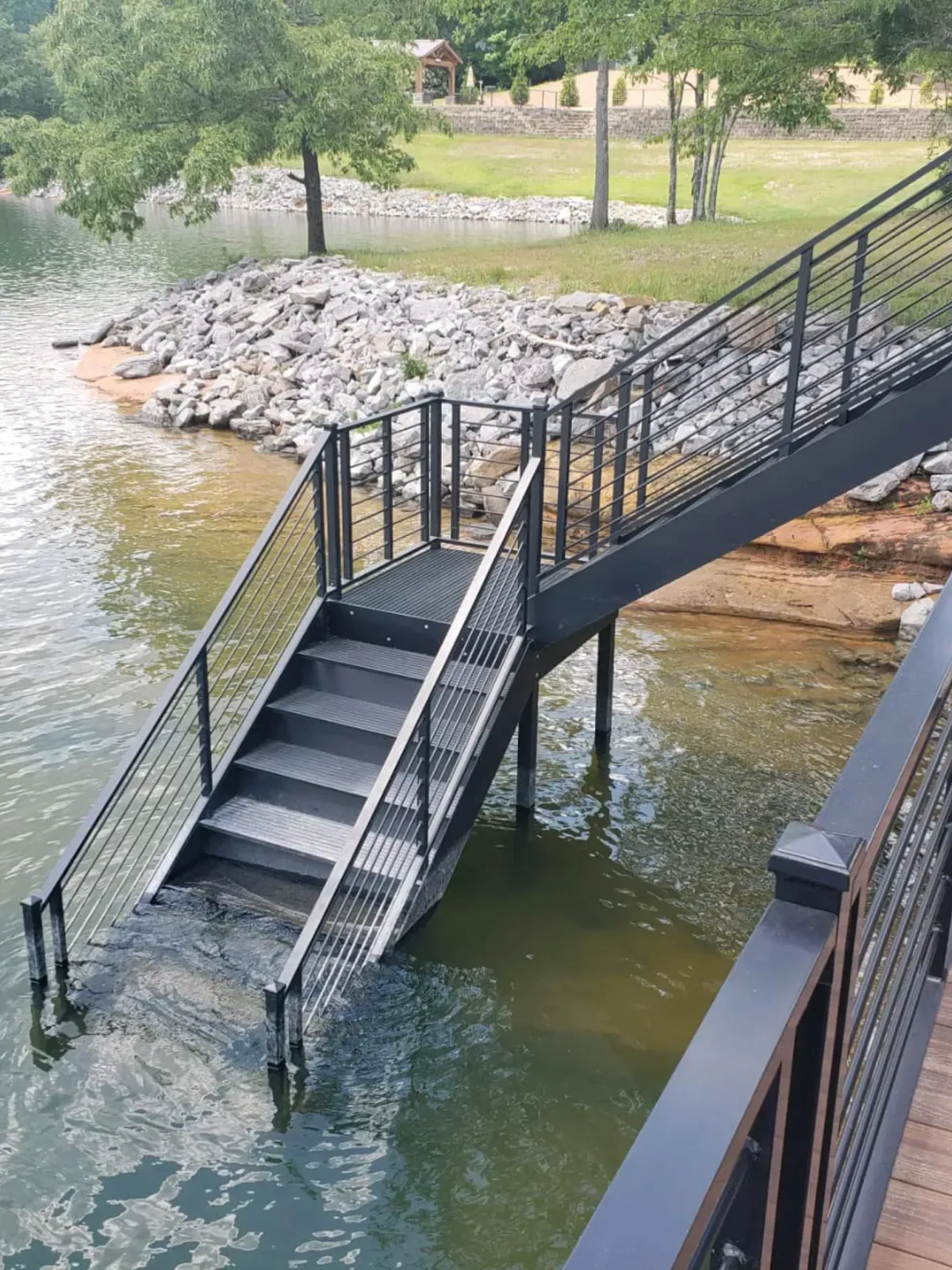 Whether you need custom railings for docks and decks, lakeside stair systems, shoreline walkways, swim platform railings, balcony railings, security gates, or ornamental accents, our experienced team has the expertise and technology to build it right. With advanced 3D measuring tools, in-house fabrication, and corrosion-resistant powder coating, we craft ironwork that fits perfectly, looks exceptional, and stands up to lakefront weather for years to come.